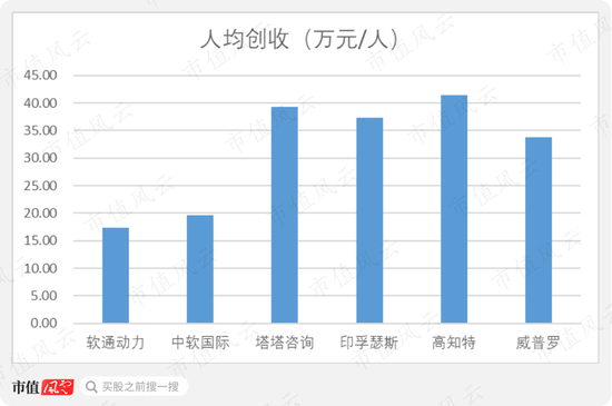 2019年,人均创收规模最高的是高知特,41.36万元/人,是软通动力、中软国际的两倍多;最低的威普罗也有33.73万元/人,依然远高于软通动力、中软国际。