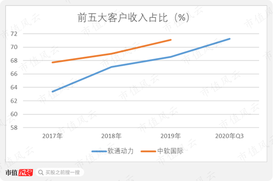 相比来看,软通动力的客户集中度要略低于中软国际,2019年前五大客户的集中度分别为65.55%、71.10%。