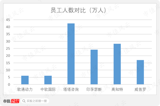 对比来看,软通动力、中软国际两家公司与他们之间还有不小的差距。其中,塔塔咨询的员工人数最多,拥有42.43万人,是软通动力的将近七倍;员工人数最少的威普罗,也有17.00万人,规模约等于三个软通动力。