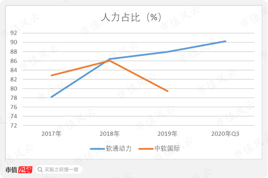 对比来看,软通动力的人力成本上升速度,要快于中软国际。2017年,软通动力的人力占比还明显偏低,然而到2019年已经超过中软国际。