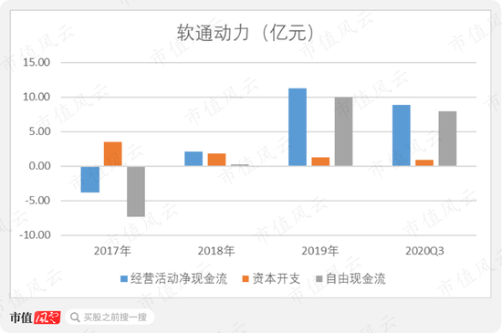 风云君发现,软通动力、中软国际的自由现金流都不是特别稳定,都曾在2017年、2018年表现为流出状态,在进入2019年之后才开始明显好转。