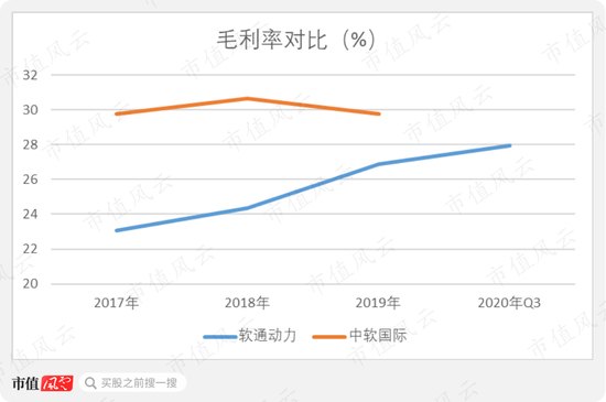 首先,毛利率方面,2017年-2020年9月,软通动力的毛利率持续增长。但对比来看,软通动力仍与中软国际有不小差距。