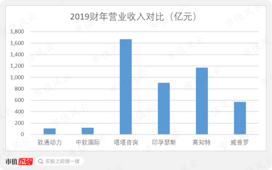 收入规模上,软通动力和中软国际也是不出意外的被秒杀。2019财年,塔塔咨询实现营业收入15,694.90亿印度卢比,约折合人民币1,670.16亿元,规模最小的威普罗实现营业收入80.94亿美元,约折合573.47亿元。