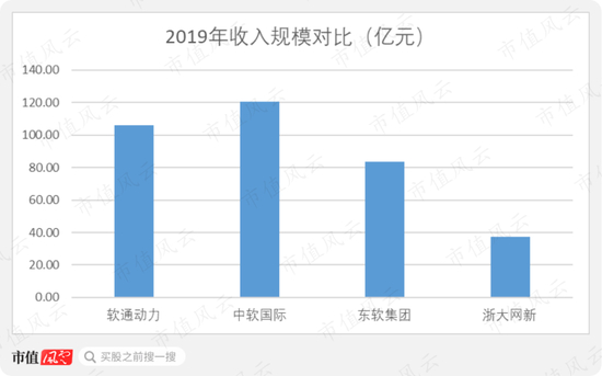 2019年,东软集团和浙大网新的收入规模明显落后,而软通动力和中软国际两家公司的收入规模均已超百亿元。