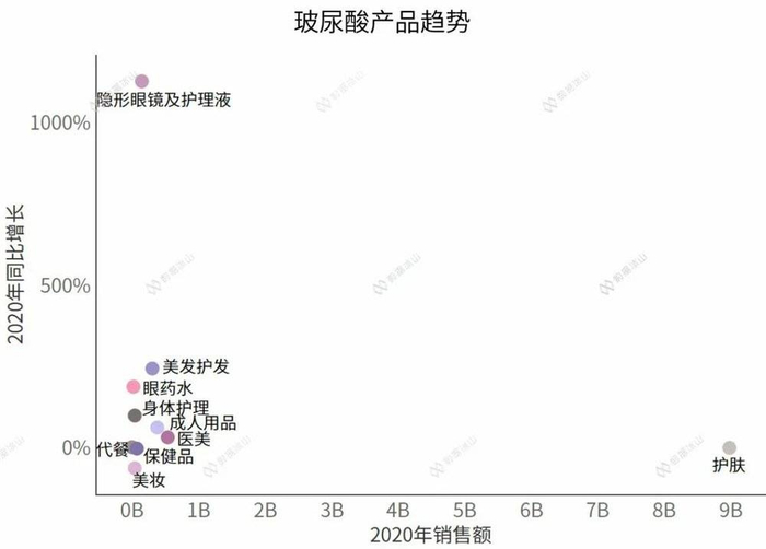 玻尿酸产品发展至今,主要还是集中在护肤领域。虽然也有口服的保健品,但销售额仅排在第五名。排在前面的护肤和医美,是常见的玻尿酸用途,暂且不提,但成人用品和美发护发产品的销售额和同比增长比保健品还高,就让人非常惊讶了。