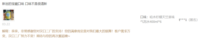 然而让人最为迷惑的是,这瓶气泡水是“柠檬天竺葵味气泡水”。虽说天竺葵这个成分比较小众,听起来很高级,但是很难让消费者对味道有个直观的感受,产生共情。冰山君和同事们讨论的时候就有人提到“有一种不宜服用的感觉”“听起来像是洗洁精的味道”。为数不多的评论当中也只提到“口味不是很清新”,看上去也不像柠檬的口感。