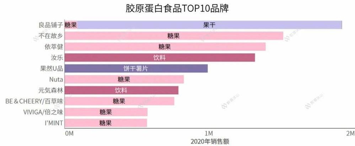 从胶原蛋白零食饮料TOP10品牌来看,除了良品铺子、元气森林和百草味以外,其余均为新兴品牌,产品类型也集中于糖果。可以看出,知名品牌并没有绝对的优势,可口可乐的睡醒颜饮料、冰力克的薄荷糖、蒙牛的暖妍酸奶、屈臣氏的花物水、明治的果汁软糖等产品都没能脱颖而出。