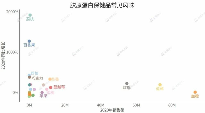 那什么样的风味才比较受欢迎?冰山君统计了一下胶原蛋白保健品的常见风味,清新的水果味更受消费者的喜爱。