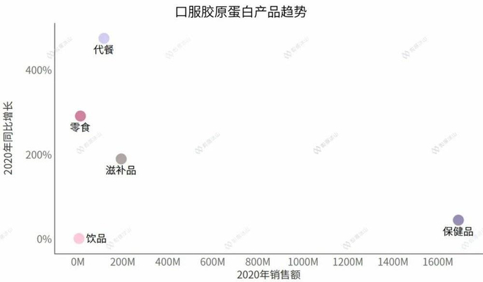 可以发现,除了饼干薯片外,其他产品大多是比较水润、粘稠或有弹性的,加工过程较为健康,与胶原蛋白成分的形象比较类似。