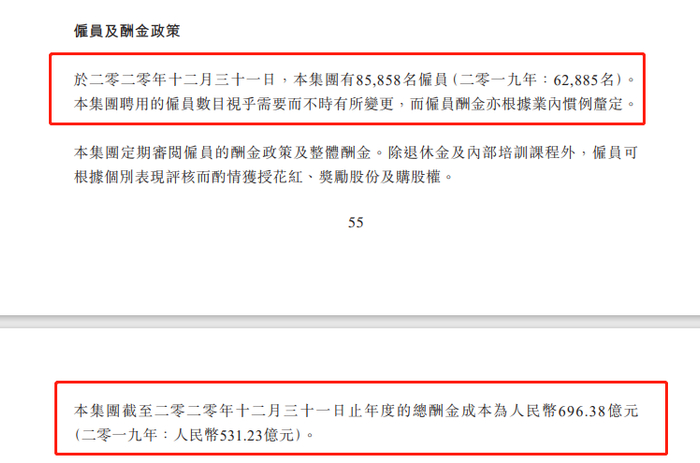 这些员工合计给多少薪酬成本?腾讯表示,根据招聘员工数量需要而对薪酬进行变更,雇员的薪酬则根据行业标准进行厘定,除了退休金和内部培训课程外,员工根据个别表现考核,酌情给予红花、奖励股份和购股权。