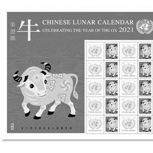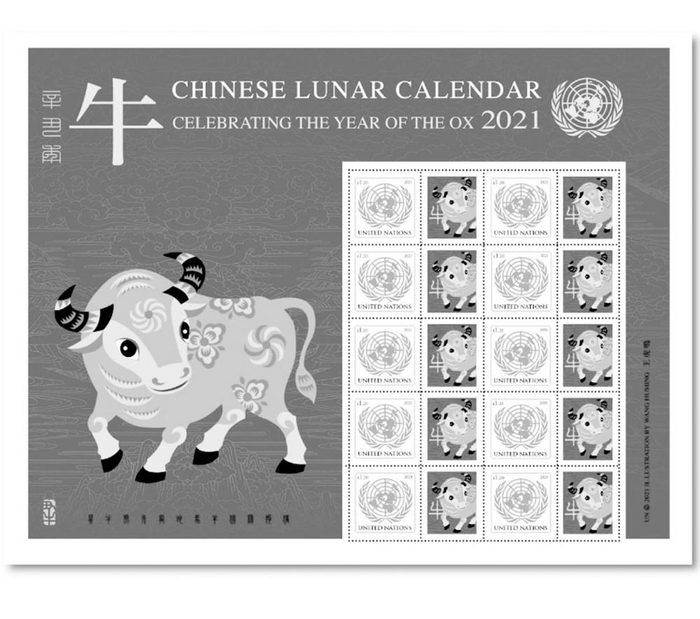 联合国邮政于1月22日发行牛年生肖个性化邮票,其主票为联合国徽志,副票则是一头活泼可爱的剪纸形象小牛,该图案由中国邮政集团有限公司邮票印制局设计总监王虎鸣设计。值得一提的是,联合国邮政管理局于2010年5月开启以中国生肖为内容的生肖邮票的发行,今年的牛年生肖邮票也是这一轮的收官之作。