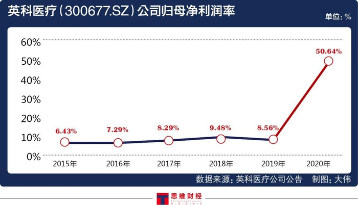 《投资者网》整理其近五年的数据后发现,英科医疗2020年的营收为138.36亿元,同比增长564%,超过过去四年营收的总和;营业净利润更是在2020年创下了70.07亿元的新高,同比增长3837%;2020年公司的归母净利润率为50.64%,同比增幅超过490%。