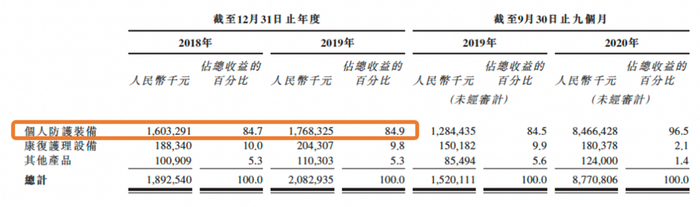 据2020年年报,公司个人防护类收入金额为134.52亿元,占当年营收的97.22%,同比增长660.23%。