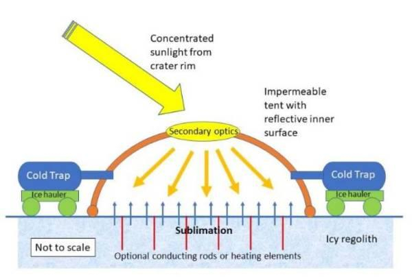 下图展示了一种“热采矿”工艺。用精心设计的镜子或透镜将太阳光射入环形山的“永久阴影区”里,让冰升华成水蒸气,两边各放置一个冻干机,让水蒸气凝结成水,搜集起来。