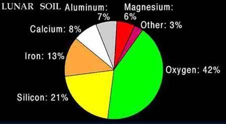月球表面的化学成分主要有:石英(二氧化硅SiO2)、氧化铝(Al2O3)、氧化钙(CaO),氧化铁(Fe2O3)、氧化镁(MgO)、二氧化钛(TiO2)、氧化钠(Na2O),都是含氧物质。约莫估算一下,月壤里的氧元素约占40-45%。但要把其中的氧元素提炼出来,都不是简单的事情。
