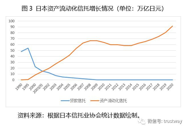 随着运用领域的快速扩大,自1995年开始,资产流动化信托规模快速增长(见图3),2007年达到62.7万亿日元,超过贷款信托历史最高值。近年来该类信托规模持续增长,至2020年末已达到91.1万亿日元。