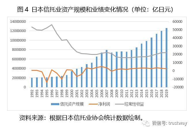 从信托业业绩来看,经过10年的大幅波动和调整,经常性收益和净利润在2003年开始企稳(见图4),净利润开始扭亏为盈。此后,经常性收益基本稳定在2万亿日元上下,而净利润除受2008年金融危机影响的几年外,基本保持在3000亿日元左右,超过了20世纪90年代初的水平。