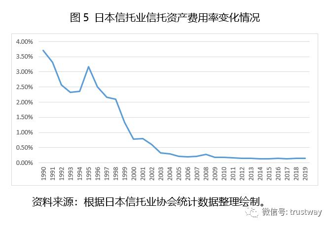 在行业集中度大幅提高的基础上,日本信托业的规模效应显现出来,信托资产费用率(经常性费用/信托资产规模)快速下降(见图5),2003年以后基本维持在0.3%以下的水平。