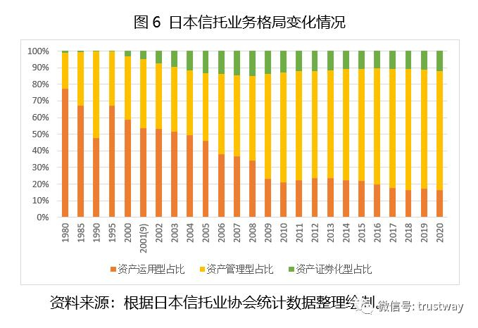 此次转型后,随着资产流动化信托业务的快速增长,既扩大了信托功能运用领域,也丰富了年金信托、金钱信托、金外信托的投资范围,两者相互促进,极大改善了日本信托业务格局,日本信托业核心功能从单一的长期金融,转变为资产管理、资产流动化和资产运用三者并重(见图6)。