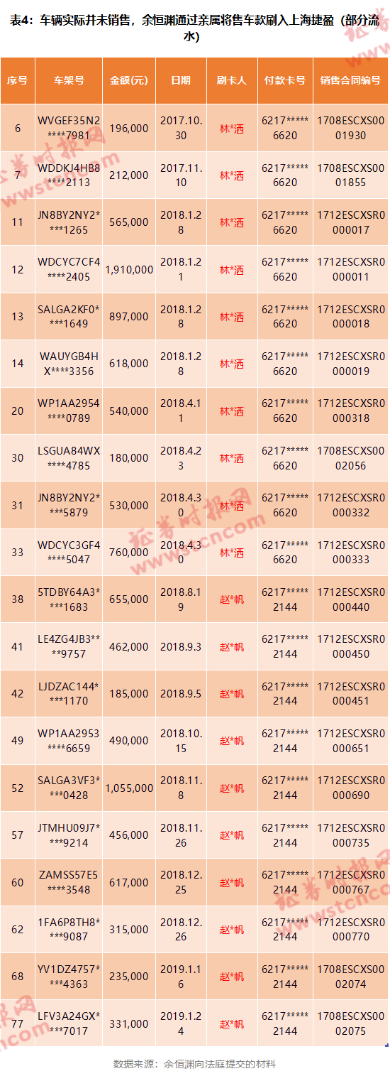 而由上海捷盈出具的材料显示,双方自2017年7月至2019年4月合作期间,其账户共计收到656台车的车款。证券时报记者随机每月抽取了一台车的资金流水轨迹,皆符合上海捷盈先收取车款,再向余恒渊个人账户返还成本的特征(表3)。