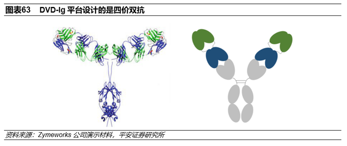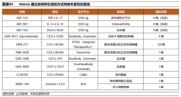公司是一家研究型生物制药企业,公司在全球各地共有超过3万名员工。公司凭借拥较强的研发实力开发了修美乐(阿达木单抗),该款单抗自2002年上市,连续8年位居全球最畅销药物榜单首位。公司建立了DVD-Ig(Dual Variable Domain-Ig)双抗技术平台,通过在正常IgG抗体的轻链和重链的N末端或C末端连接另外的VH或VL结构域以形成双特异性抗体,因此DVD-Ig双抗每个轻链和重链包含两个可变域,从而形成四价双抗,具有更高的特异性结合能力。DVD-Ig双抗保留了来自其两种亲本抗体的抗原结合特异性、亲和力和生物学活性,具有较高稳定性。利用该平台,公司目前已经成功研发了ABT-122、ABT-981和ABT-165三款双抗药物,目前均已完成II期临床。