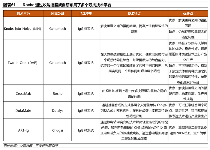 历经60年发展,双抗技术已逐步成熟。双抗作为人工抗体,主要通过将2个不同的H链和2个不同的L链组合而成,这种随机组合方式可以产生16种不同的组合,难以从中分离目标双抗,该现象被称为“链交换问题”。历经多年发展,目前双抗轻重链错配问题逐步得到解决,形成了包括KIH、Crossmab、DuoBody、BiTE、TandAb在内的40余个特色技术平台。各个平台之间的结构设计有所差异,通过不同的方式解决双抗的技术难点。