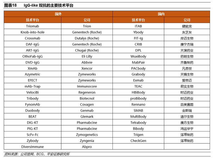 随着双抗研发热度持续提升,目前全球范围内已出现了超过30个IgG-like双抗技术平台,部分产品已进入临床试验。