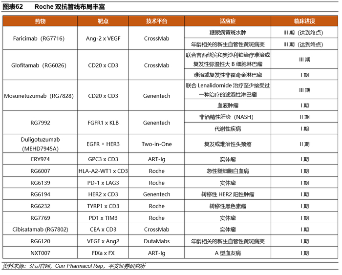 公司是一家全球领先的制药企业,一直走在癌症研究与治疗领域前沿,业务遍布超过100个国家及地区。公司拥有较强的研发能力和销售渠道,拥有多款全球明星产品,包括Avastin、Herceptin、Rituxan和Tecentriq等。为保持竞争力,公司持续布局前沿技术,包括双抗、ADC和基因疗法等。双抗方面,公司的Hemlibra是目前唯一一款销售收入突破20亿美元的上市双抗产品,强化了公司在血液病方面的地位。此外,公司通过收购或自研等方式持续完善双抗技术布局,目前共拥有至少5个双抗技术平台,解决不同研发问题。