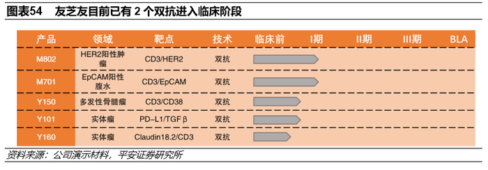 目前,公司进度最快的双抗是M701,该款双抗的靶点与之前退市的Removab相同,但在结构上做了一些改进:1)使用了较低亲和力的CD3序列和ScFv结构提高安全性;2)Fc端敲除了ADCC功能,降低免疫活化程度;3)全人源化双抗的设计降低了免疫原性。因此,从目前的临床数据来看,公司M701的安全性相对较好,有望成为国内首款治疗恶性腹水的双抗产品。
