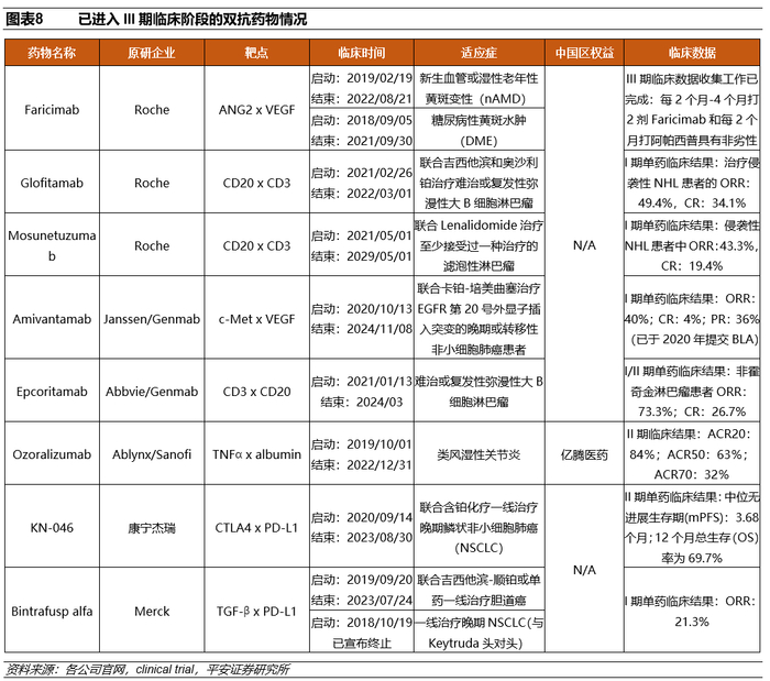 现在进入临床III期的双抗药物一共有8款,其中1款由国内企业自主开发,是康宁杰瑞的KN-046。而进入III期双抗药物数量最多的公司是Roche,共有3款药物。