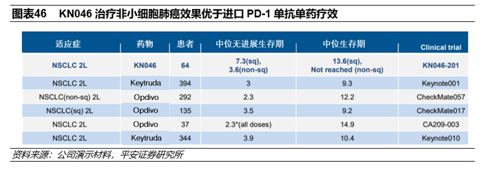 伴随临床持续推进,公司目前也已陆续公布部分临床试验数据,KN046在非小细胞肺癌、食管鳞癌、免疫疗法失败患者和鼻咽癌等适应症方面展现出了较为良好的安全性,以及相较于免疫检查点抑制剂单抗更好的疗效。