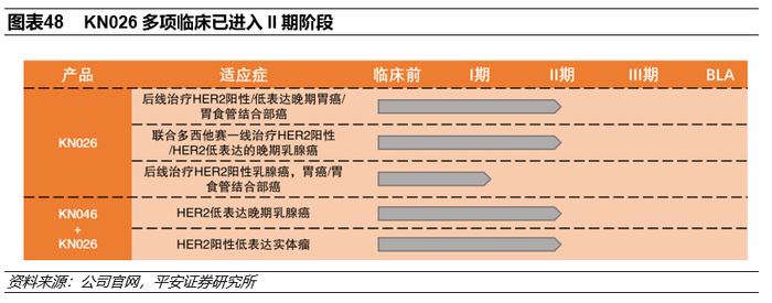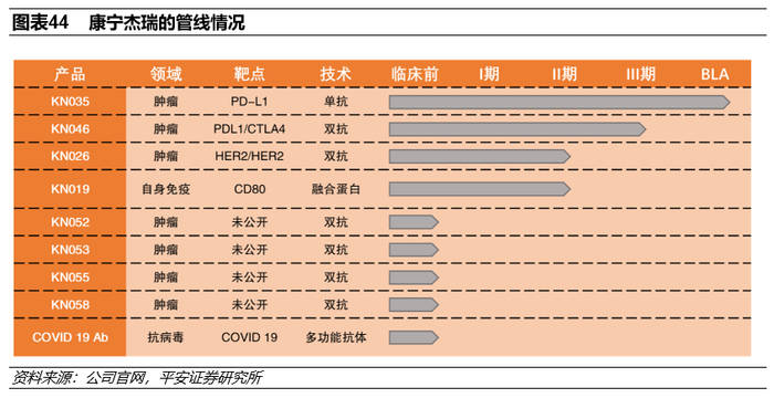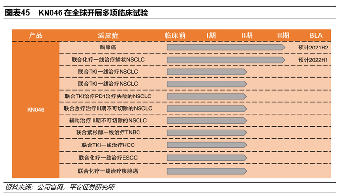 该双抗在临床中也体现较好的安全性。I期试验中,出现三级以上的治疗相关不良反应的只有2个患者,占比6.9%。目前,KN046在澳大利亚和中国已开展10余种肿瘤不同阶段临床试验。FDA基于其在澳大利亚和中国取得的临床试验结果,批准KN046在美国直接进入Ⅱ期临床试验,并于2020年9月授予其治疗胸腺上皮肿瘤的孤儿药资格。目前KN046的两项注册临床试验预计将在2021、2022年申报BLA。