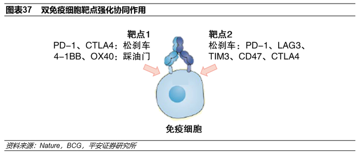 伴随免疫疗法的研发推进,近年以PD-1单抗为代表的药物取得突破性进展,已成为肿瘤治疗的重要手段。然而,免疫检查点单抗药物的临床效果较为有限,患者中的应答率仍然较低。因此,以联合用药产生的协同效应为理论基础,靶向2个免疫细胞表面抗原的双抗药物成为研究热点,旨在加强免疫细胞肿瘤识别杀伤作用。按照靶点机制,该类双抗可以分为松刹车+松刹车(作用于两个免疫检查点)、松刹车+踩油门(作用于一个免疫检查点和一个免疫活化靶点)。由于目前多数企业具备相应的免疫检查点抗体药物研发管线,因此在此基础上设计构建该类双抗速度相对较快。
