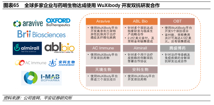公司是全球领先的开放式、一体化生物制药能力和技术赋能平台,为全球生物制药公司和生物技术公司提供研发服务。公司开发了双抗研发技术平台WuXibody,基于最新的工程设计,该平台可以加快6-18个月的研发进程,大幅度降低产品的成本。WuXiBody平台将几乎所有单抗序列对组装成双抗结构,其特有的结构灵活性使得该平台便于建立具有不同价位的多种双抗形式。使用WuXiBody生产的双特异性抗体具备生产成本低、稳定性强、半衰期长、免疫原性低、纯化简单等优势。因此,全球多家企业选择与药明生物合作开发双抗产品,未来伴随研发生产逐步推进,利好公司业绩成长。