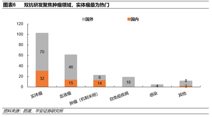 根据药渡数据库显示(不完全统计),全球目前有218款双抗药物处于临床及临床前阶段。从适应症来看,超过80%的管线集中在肿瘤领域,其中实体瘤赛道较为热门。