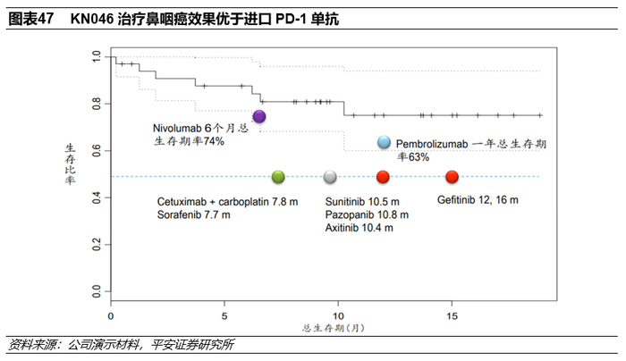治疗鼻咽癌的临床数据显示,与Opdivo和Keytruda单药治疗以及放化疗联用相比,KN046的患者总生存期和生存比率显示出一定优势。