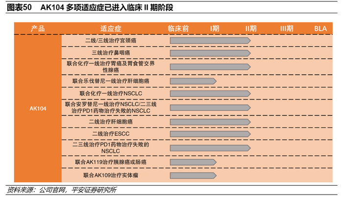 AK104是公司自主研发的4价全长型PD-1/CTLA-4双抗,旨在实现与PD-1/CTLA4共表达的肿瘤浸润淋巴细胞,而不是正常外周组织淋巴细胞的优先结合,提高肿瘤免疫治疗的安全性。AK104同时靶向两个免疫检查点分子,目前已显示出PD-1及CTLA-4单抗联合疗法的临床疗效以及相对更好的安全性。目前AK104同时在开展超过10项临床试验,并在dMMR癌症、宫颈癌和胃癌领域中体现出一定疗效。