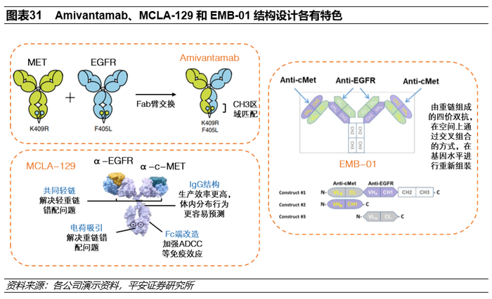 由于这两个靶点之间的协同作用比较清晰,因此研发热度相对较高,国内外至少6家企业同时在推进,其中进度最快的是Amivantamab,正在开展临床II期。虽然靶点相同,但各个企业在双抗设计上有所区别。例如,Amivantamab(强生) 通过引入突变减少轻重链错配,而MCLA-129(Merus/贝达)通过使用共同轻链减少错配。相比这两款双抗都是单价结合抗原,岸迈生物的EMB-01采取了4价(2+2)结构,理论上能够加强抗原和抗体的结合能力。