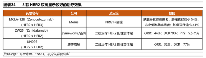HER2-HER2双抗的理论基础主要是曲妥珠+帕妥珠联合疗法的成功。该类双抗通过同时结合两个非重叠的HER2表位,实现对于HER2信号通路的更完整的阻断。这种独特的设计可形成多种作用机制,包括双重阻断HER2信号、增强结合并去除细胞表面的HER2蛋白、强有力的抗体效应子功能,提高肿瘤细胞杀伤作用等。目前国内在研的主要有康宁杰瑞的KN026,以及百济神州与Zymeworks合作的ZW25,类似机制的还有Merus的MCLA-128(HER2 x HER3)。