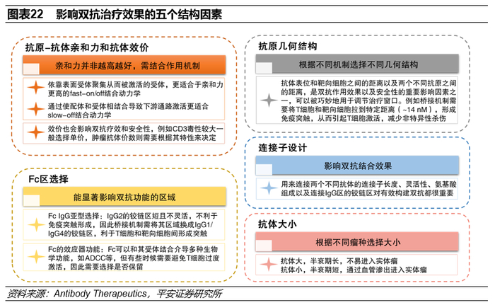 整体来看,双抗的结构形式决定分子的生物学活性。不同靶点双抗或者相同靶点双抗之间的差异性以及其效果和安全性,主要会被五个结构因素影响,分别为抗体亲和力和效价、Fc区、几何结构、连接子和分子量。而这五个结构的选择通常取决于双抗作用机制以及适应症的类型,根据使用靶点机制的不同,双抗的设计和结构也会有不同考量。