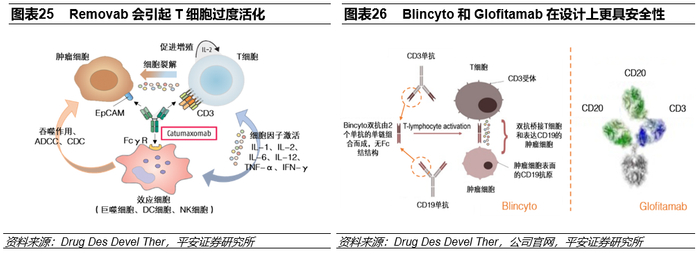 除CD3外,部分公司选择PD-1、4-1BB等免疫靶点,相比之下,CD3对T细胞的激活和招募能力更强,但对双抗平台的研发设计能力要求也较高。已上市的三款药物中,Removab(CD3 x EpCAM)和Blincyto(CD3 x CD19)都是使用靶向CD3的桥接机制。其中Removab虽然展现出较好的疗效,但会产生较严重的副作用,其主要原因是该药即使低剂量给药也会引起T细胞过度活化,从而诱发细胞因子快速且剧烈的释放,引发较严重的细胞因子风暴。研究发现,T细胞的过度活化主要和该抗体的CD3抗体Fc介导的免疫效应以及亲和力等因素相关。