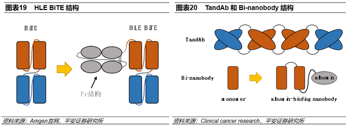 Amgen公司开发的BiTE是非IgG样双抗中最早拥有上市品种的技术平台,主要是将一个抗体的scFv与另一个抗体的scFv通过合理的linker串联成双抗。基于该平台开发的Blincyto于2014年获FDA批准上市,其使患者的中位总生存期相比标准化疗延长了一倍,效果显著。然而,Blincyto的半衰期仅有2个小时,患者需要频繁给药,依从性较差,因此上市后的销售表现也受到影响,2020年仅实现3.79亿美元收入。为改善半衰期问题,Amgen在BiTE平台基础上发明了Half-Life Extended(HLE)-BiTE技术,通过将Fc结构融合入BiTE结构,大幅改良其半衰期,从2小时延长至44-167小时。