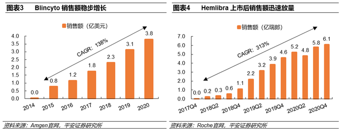 而Blincyto和Hemlibra两款双抗药物技术相对更成熟,在临床上也展现了较好的疗效,因此自上市后一直保持放量,2020年分别实现3.79亿美元和21.90亿瑞郎(约24.44亿美元)收入。