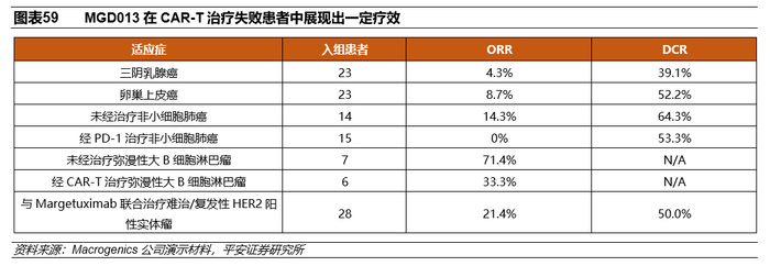 公司与美国MacroGenics公司达成三个产品合作,分别为TRIDENT(多特异性分子)、Margetuximab(HER2单抗)以及MGD013(PD-1 x LAG3双抗),公司获得上述产品在大中华区的开发及商业化独家授权。其中,MGD013(Tebotelimab)是MacroGenics公司利用DART平台开发的同时阻断PD-1和LAG3两个免疫检查点的双抗药物,用于激活T细胞对于肿瘤的杀伤效应。从已公布的数据来看,MGD013在血液瘤中展现出较好治疗效果,并且对于CAR-T治疗失败的患者有一定疗效。同时,MGD013也展现出较好安全性,仅5.4%的患者出现与治疗相关的三级以上不良反应。全球范围内该款双抗已进入II期临床,国内CDE也于2020年5月批准I期临床试验。