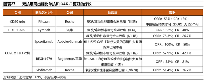 从临床数据来看,双抗已体现出与单抗相比差不多甚至更好的疗效,CR(完全缓解率)普遍较高。与目前较为热门的CAR-T疗法相比,双抗也展现出亮眼的治疗效果,甚至在CAR-T治疗失败患者中也体现出完全缓解的疗效,同时还具备给药方便以及费用低的优势。