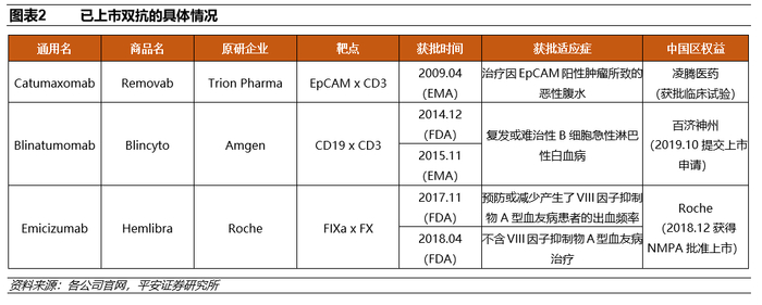 目前已获批上市的三款产品分别为Removab、Blincyto和Hemlibra。其中,Removab作为全球首个商业化的双抗药物,因销售不佳及副作用等原因于2017年退市。