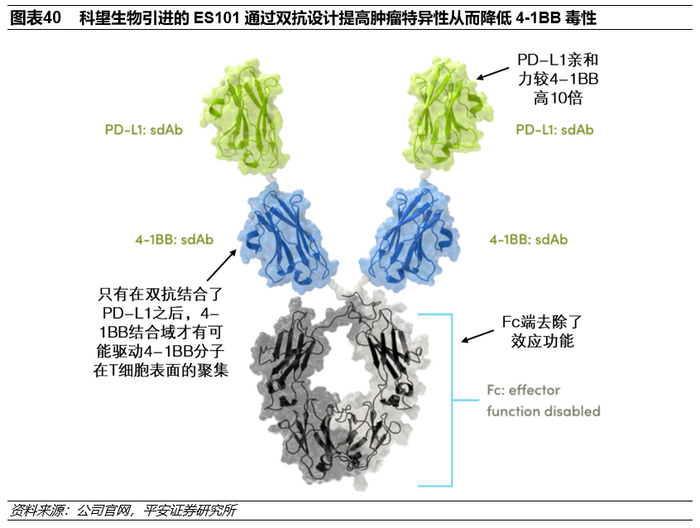 免疫活化靶点由于其毒性较大,此前单抗研发较为受阻,而双抗可以使得其激活效应局限于肿瘤环境,特异性更强,从而在提高病人抗肿瘤免疫反应的同时降低这类治疗中伴随的副作用。例如科望生物从Inhibrx引进的ES101(PD-L1 x 4-1BB)。4-1BB作为免疫激活剂单药使用时会出现较严重肝毒性,该款双抗通过设计成上面是PD-L1下面是4-1BB的4价抗体,使得双抗要先与PD-L1结合产生触合效果,才能激活4-1BB,保障其肿瘤环境中发挥作用,大幅提高安全性。I期临床中,该款双抗也表现出相比使用4-1BB单药显著降低的肝毒性。