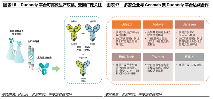 Fab臂交换是人体内的IgG4抗体也会天然发生的一个过程,然而该过程是随机的,可以在两个相同抗体之间发生。Genmab对交换机制深入研究后发现,在抗体的CH3区引入不对称突变,可迫使Fab臂互换反应变为定向的,从而得到高度稳定的异二聚体蛋白,并基于此开发了可以产生稳定双抗的DuoBody技术平台。该技术已实现1500L规模的产业化应用,受到广泛关注。Genmab已与多个制药公司,包括艾伯维、强生和吉利德等达成合作,利用DuoBody共同开发双抗药物。