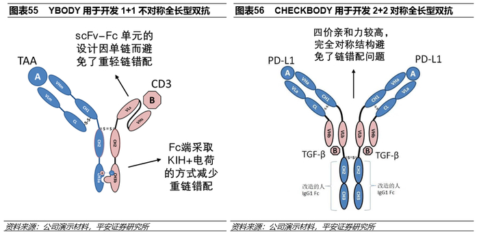 YBODY是公司开发的第一代双抗平台,主要用于设计二价非对称全长型双抗。YBODY设计的双抗由靶向抗原A的Fab-Fc单元以及靶向抗原B的ScFv-Fc单元组成,两个单元之间通过添加盐桥和KIH的方式形成有效异聚体,大幅降低错配率。Fab-Fc单元和单抗的亲和力基本一致,而ScFv-Fc单元的亲和力相比母抗体有明显弱化,因此可以用于靶向CD3,提高双抗安全性。目前,公司进度较快的双抗中,M701、M802和Y150均是使用YBODY平台设计。CHECKBODY是公司开发的新一代双抗平台,用于设计四价对称全长型双抗,抗体的N端为靶向抗原A的Fab,中部为靶向抗原B的Fv,双抗对抗原A和B均具有与母抗体一致的高亲和力,Y101是使用该平台构建。