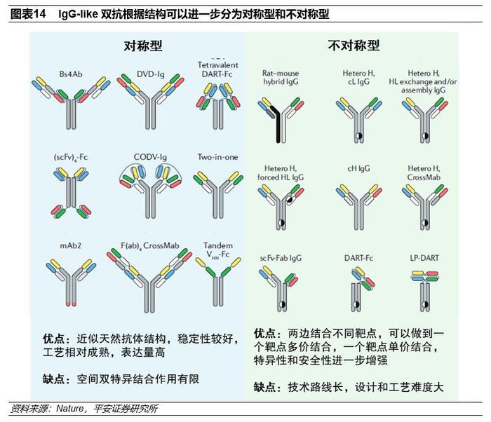 IgG样双抗分子设计时利用整个IgG结构作为骨架,构建一个具有双特异性或者多特异性的二价或多价抗体,由于具有跟天然抗体一样的结构,CMC工艺更成熟,且体内分布行为更好预测。从结构来看,IgG-like双抗又可以进一步被分为对称模式和不对称模式。对称IgG样双抗具备和天然IgG相似的结构和较高的稳定性,不存在错配问题,因此CMC相对简单且易于生产;而不对称IgG样双抗具有桥接功能,并且可以通过调节两个抗体的效价进一步调节双抗对两个靶点的亲和力,有望提高双抗的安全性和特异性,但其生产相对复杂,需要解决重链和轻重链的错配问题。